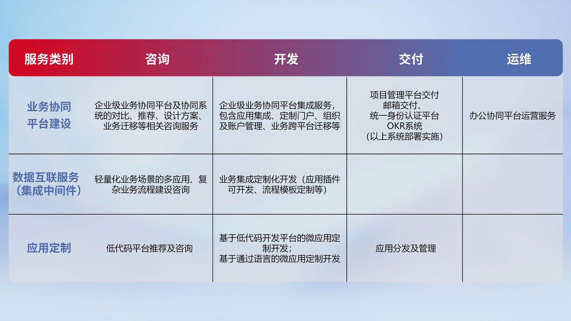针对钉钉、、企微、、、、IDaas等平台级产品提供产品的规划、、、方案、、、、交付、、定制化开发等服务,,,,实现如统一协同办公、、、、智能客户服务、、、混合会议管理、、、智能数据查询、、、等业务场景,,实现数字化转型。。。。