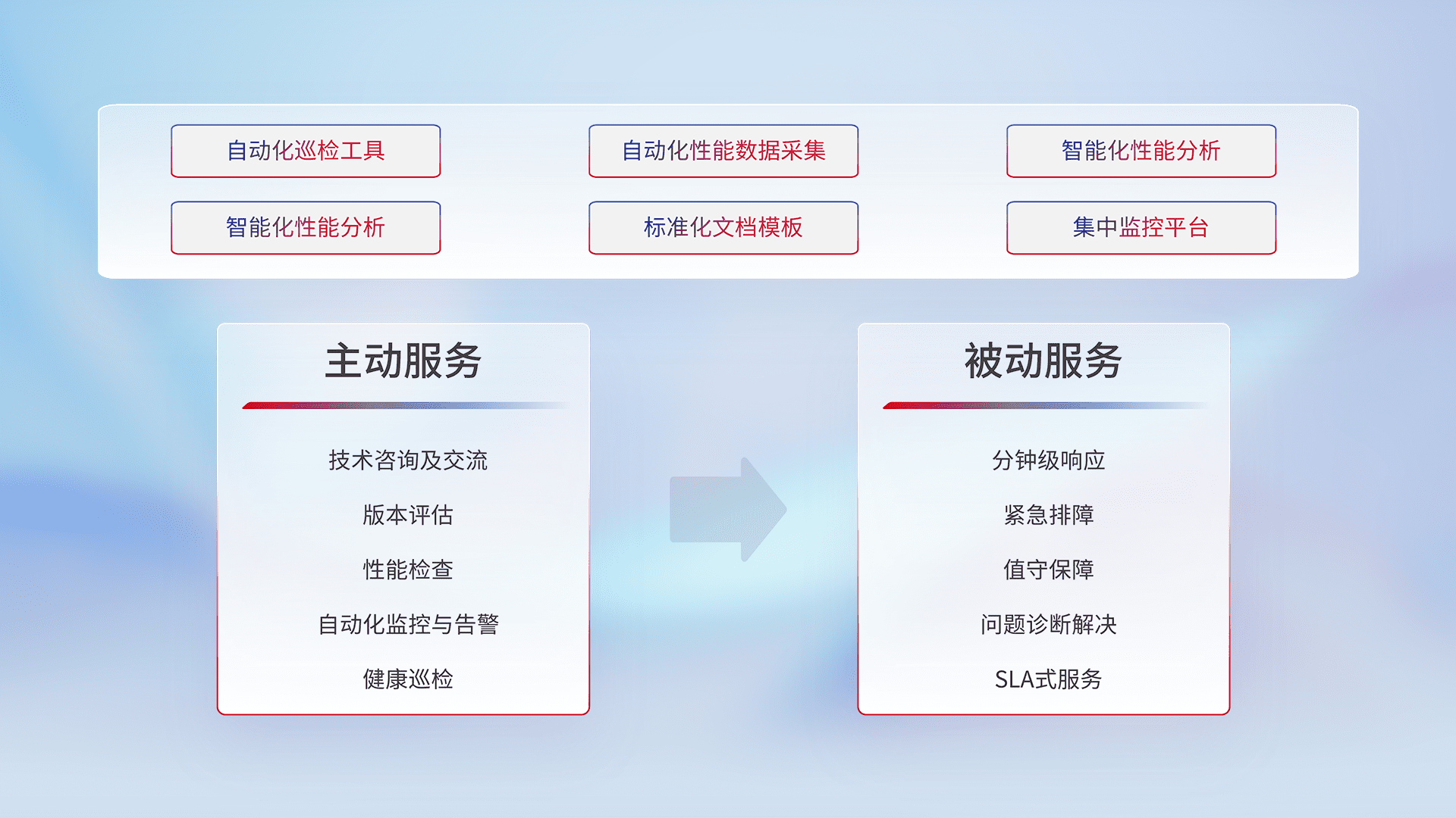 智能化工具和标准化文档,,,,保障服务质量,,,提供主动服务(包含技术咨询、、版本评估、、性能检查、、、、自动化监控与告警、、健康巡检)和被动服务包含(分钟级响应、、、、紧急排障、、、值守保障、、、、问题诊断解决、、、SLA服务)。。